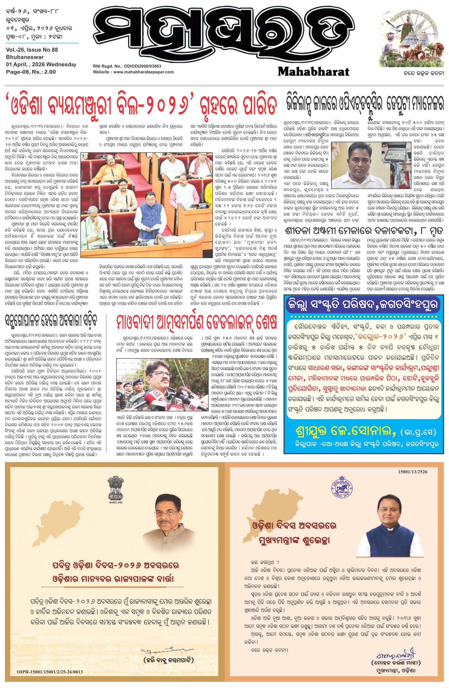 The Mahabharat Odia Daily Newspaper April 01, 2026 The Mahabharat Odia Daily Newspaper << First << 1 2 3 4 >> Last >> Page 1Page 2Page 3Page 4Page 5Page 6Page 7Page 8 × The Mahabharat Odia Daily Newspaper Page-1Page-2Page-3Page-4Page-5Page-6Page-7Page-8 Full PDF << First << 1 2 3 4 >> Last >> Page-1Page-2Page-3Page-4Page-5Page-6Page-7Page-8 Page-1