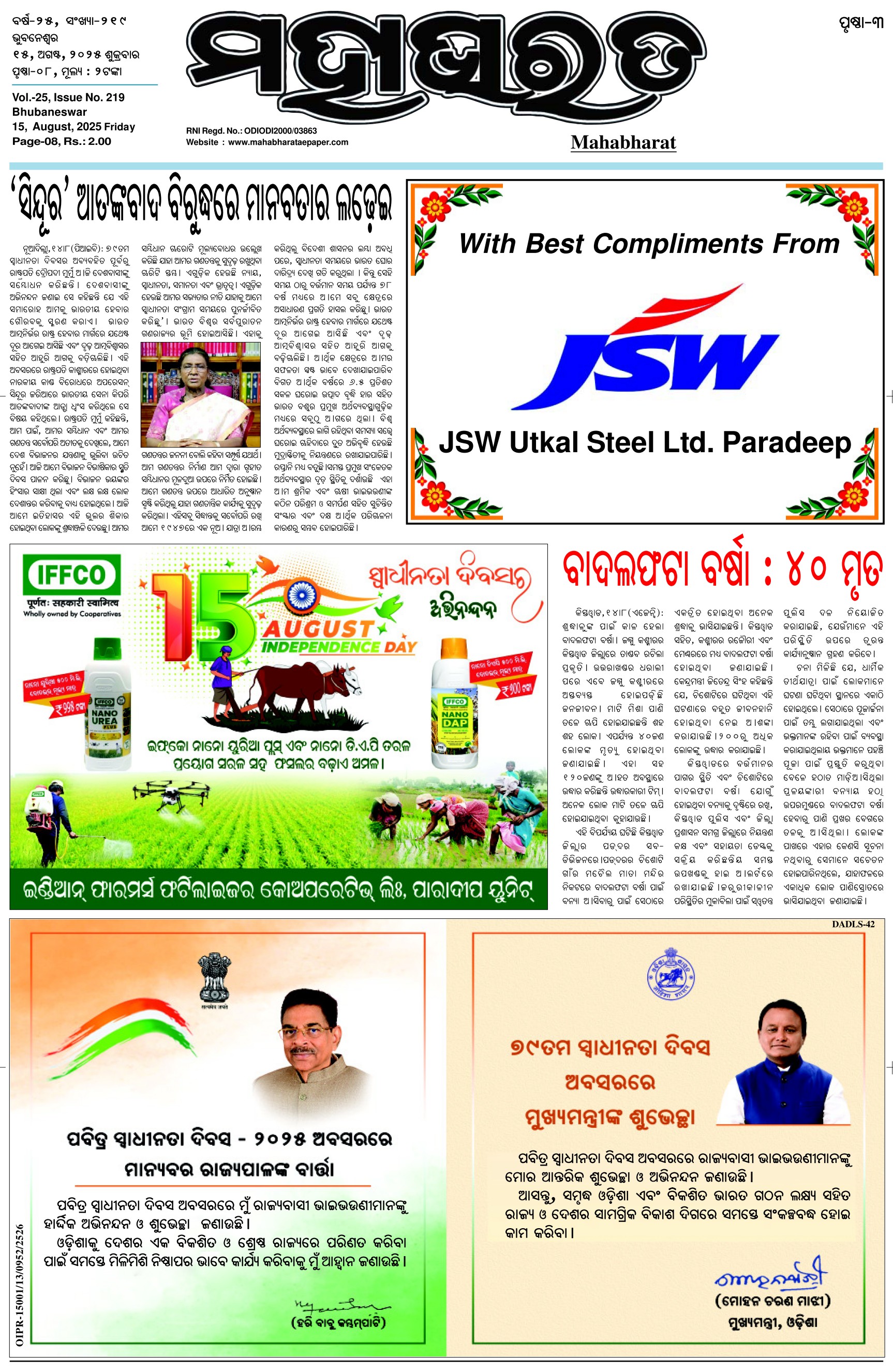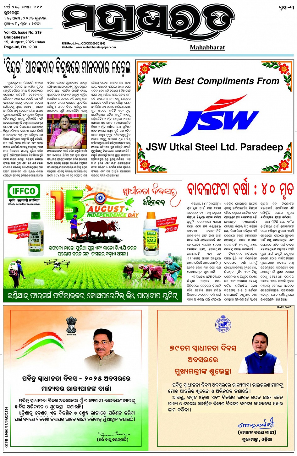 The Mahabharat Odia Daily Newspaper Page: 3 August 15, 2025 The Mahabharat Odia Daily Newspaper << First << 1 2 3 4 >> Last >> Page 1Page 2Page 3Page 4Page 5Page 6Page 7Page 8 × The Mahabharat Odia Daily Newspaper Page-1Page-2Page-3Page-4Page-5Page-6Page-7Page-8 Full PDF << First << 1 2 3 4 >> Last >> Page-1Page-2Page-3Page-4Page-5Page-6Page-7Page-8 Page-3